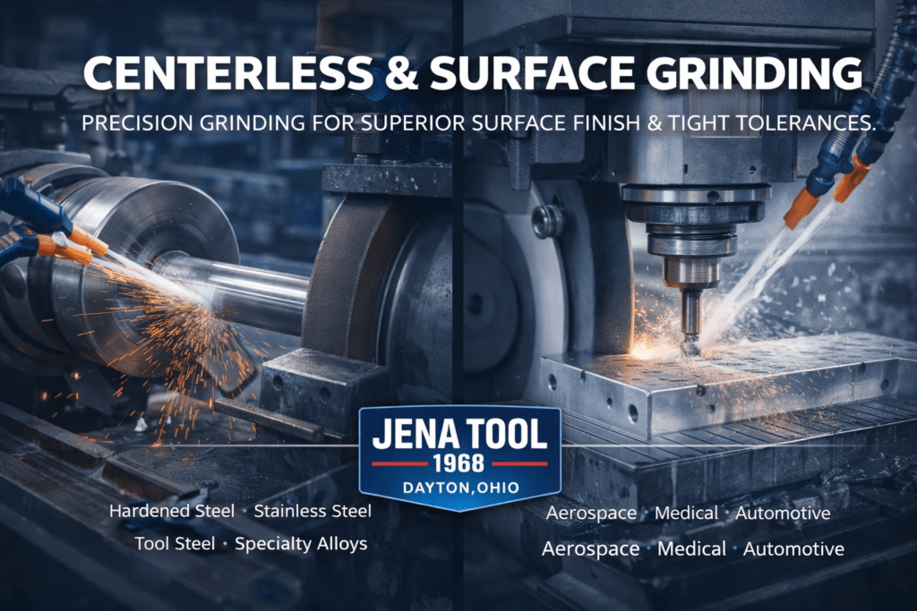 At Jena Tool, our Centerless and Surface Grinding services deliver exceptional dimensional accuracy, superior surface finishes, and repeatable precision for critical components across demanding industries.